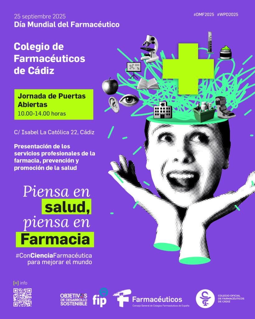 El Colegio de Farmacéuticos de Cádiz organiza para el próximo 25 de septiembre una Jornada de Puertas Abiertas para celebrar una nueva edición del Día Mundial del Farmacéutico, que se conmemora cada año en este día (coincidiendo con la fecha de fundación de la Federación Internacional Farmacéutica (FIP), y que en esta ocasión se desarrollará con el lema elegido “Piensa en salud, piensa en farmacia”.