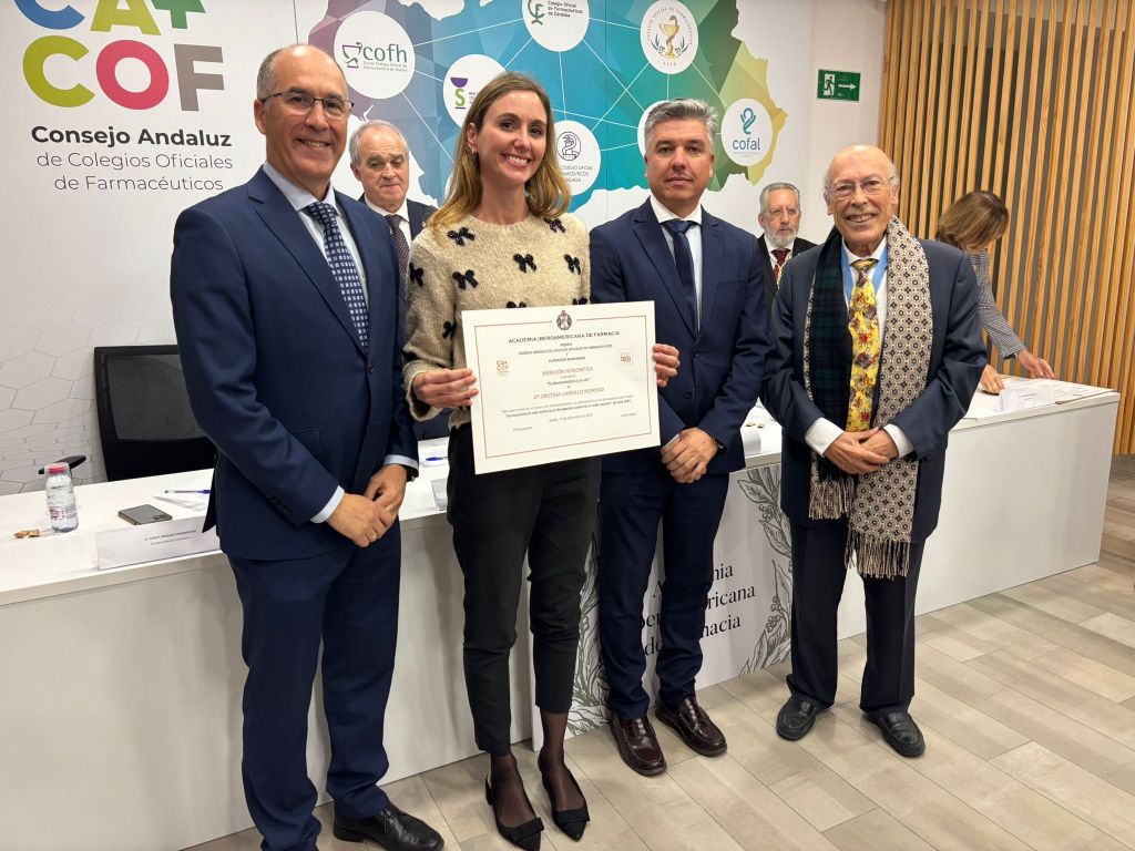 Este reconocimiento fue entregado a finales de diciembre por nuestro presidente, Alberto Virués, y el presidente de la Academia Iberoamericana de Farmacia, Alberto García Asuero, en un acto celebrado en la sede del CACOF, en el que también participó el presidente del Consejo Andaluz, Antonio Mingorance. Elena Monje García, farmacéutica rural en León, fue la ganadora de la primera edición de este Premio, en el que también se entregaron otras menciones honoríficas a los farmacéuticos Cristóbal Abrio, de Huelva, y Mario Rivera Meza, de Chile.